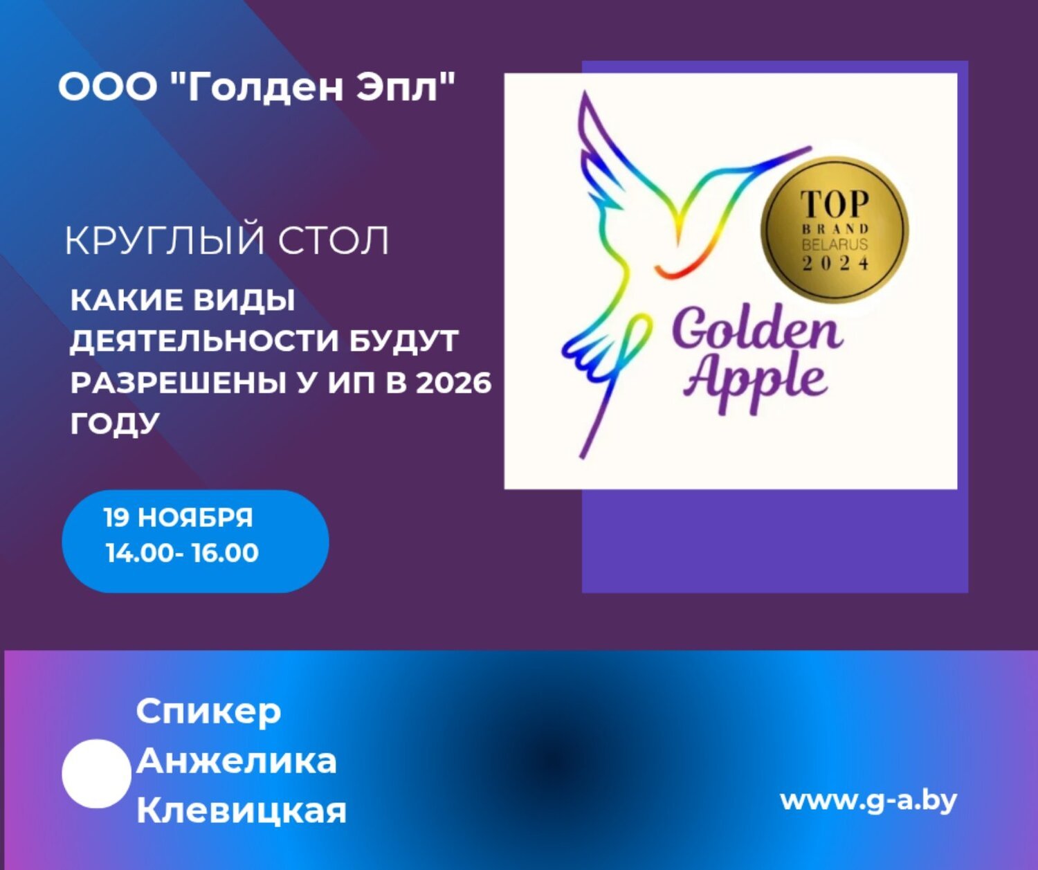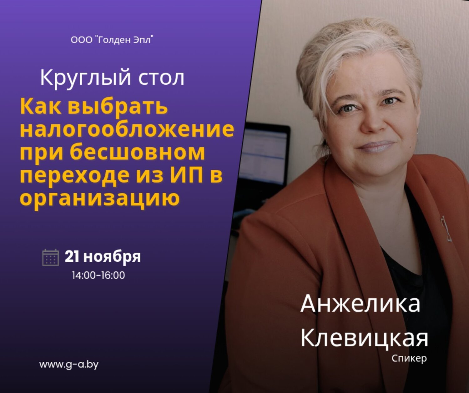 Приглашаем Вас принять участие в круглом столе, который состоится 21 ноября 2025 г. с 14.00 до 16.00 и будет посвящен теме «Как выбрать налогообложение при бесшовном переходе из ИП в организацию». Форма проведения онлайн. Предварительная запись обязательна. тел.+375259414297